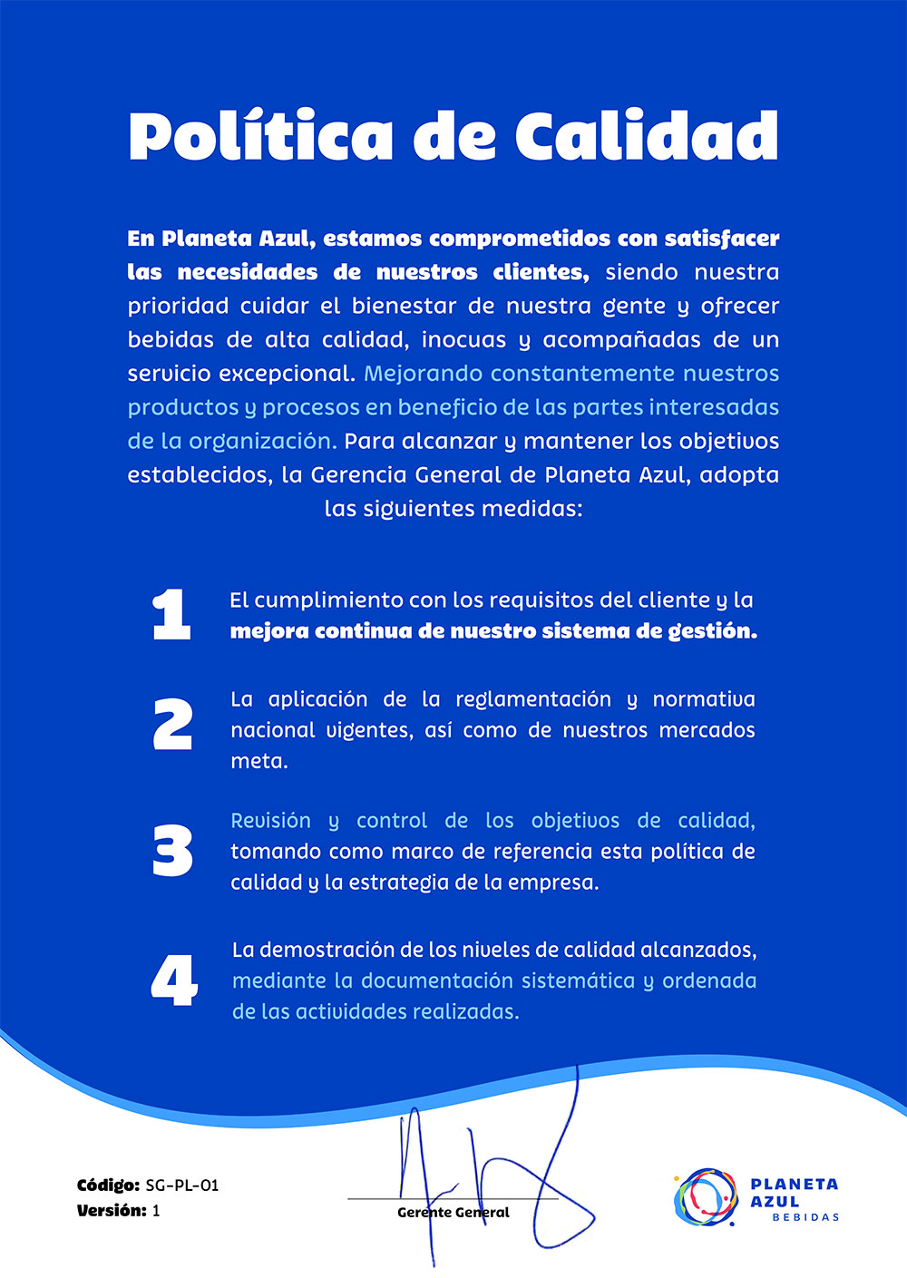 El Sistema de Gestión de la Calidad e Inocuidad que rige las operaciones de Planeta Azul como empresa alimenticia es auditado anualmente por el Instituto Dominicano para la Calidad (INDOCAL) y por la NSF Internacional, entidades que certifican nuestros productos y vigilan la seguridad alimenticia, avalando de manera sostenida el correcto funcionamiento de las operaciones, a través de buenas prácticas de manufactura (BPM) y el sistema de inocuidad HACCP. Mediante este sistema, Planeta Azul aborda la seguridad alimentaria desde un punto de vista global, ya que identifica, analiza y controla los peligros físicos, químicos y biológicos desde las materias primas, las distintas etapas del proceso de purificación, el embotellamiento, la distribución del producto y, por último, el consumo.